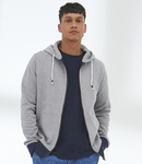 Peached finish. Brushed back fleece. Drop shoulder style. Hood with contrast drawcord. Taped neck. Full length metal zip.