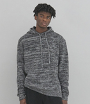 7 gauge. Chunky tuck stitch knit. Set in sleeves. Two tone marl effect. Fashion fit. Hood with drawcord.